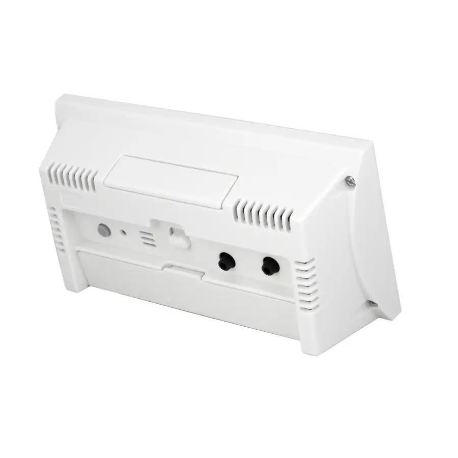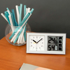 Механизм: Настольные кварцевые часы-будильник с дополнительным LCD дисплеем. На дисплее отображаются данные термометра и гигрометра, вы всегда будете в курсе окружающей температуры и влажности в помещении, где находится будильник. 4 значка экологического стандарта. Отсрочка сигнала на 5 минут. Подсветка циферблата светодиодом. Элемент питания типа АА х 2 шт. (в комплекте). Вес 200 грамм. 4 С