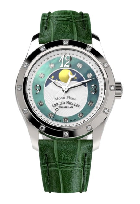 Корпус: Корпус из нержавеющей полированной стали, марки 316L. Безель и перламутровый зелёный циферблат декорированы бриллиантами, циферблат украшен декоративным узором - гильоше и защищен практичным сапфировым стеклом устойчивым к механическим повреждениям. Стрелки и накладные часовые метки с родиевым покрытием. Диаметр: 34 мм. Водозащита: 100 м.