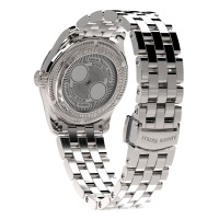 Корпус: Нержавеющая сталь. Безель декорирован бриллиантами. Перламутровый белый циферблат украшен декоративным узором - гильоше. Сапфировое стекло с внутренней антибликовой обработкой и внутренней отделкой сапфировым стеклом на задней панели. Механизм усложнен функцией – индикатором фазы луны, расположенной в районе двенадцатичасовой отметки. Диаметр 34 мм. Водозащита 50 м.