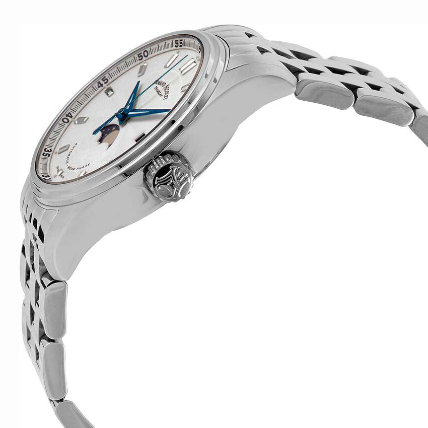 Корпус: Нержавеющая сталь. Сетлый циферблат, украшен декоративным узором - гильоше. Рифленая заводная головка. Сапфировое стекло с антибликовым покрытием, устойчивое к механическим повреждениям. Прозрачная задняя крышка. Механизм усложнен функцией – индикатором фазы луны. Диаметр 42 мм. Водозащита 100 м.