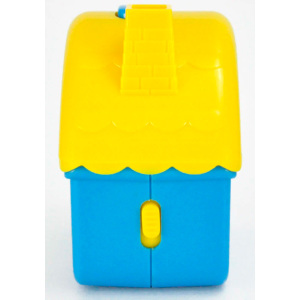 Материал и цвет: Корпус будильника сделан в виде домика из пластика синего/жёлтого цвета. Стекло – пластиковое. Белый/зелёный циферблат с крупными чёрными арабскими цифрами.