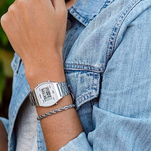Корпус: Корпус из полимерного материала серого цвета. Привлекательно смотрится цифровой дисплей с блестящей окантовкой, оттенок подобран в тон браслету. Циферблат защищён акриловым стеклом. Яркая светодиодная подсветка позволяет использовать часы в темноте, LED-индикатор мигает при окончании работы секундомера или таймера. Габаритные размеры: 38,9 x 35 x 9,9 мм. Водозащита: 5 ATM.
