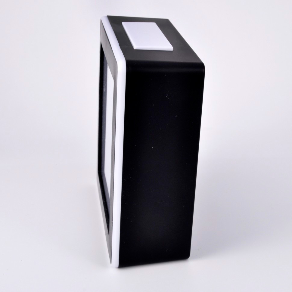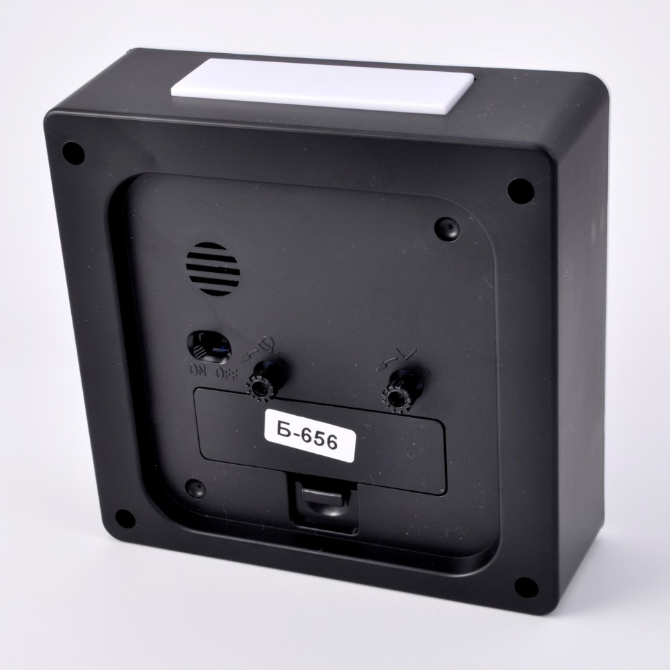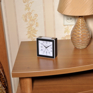 Материал и цвет: Корпус будильника квадратной формы сделан из чёрного пластика со вставкой белого цвета. Стекло – пластиковое. Белый циферблат с чёрными арабскими цифрами.