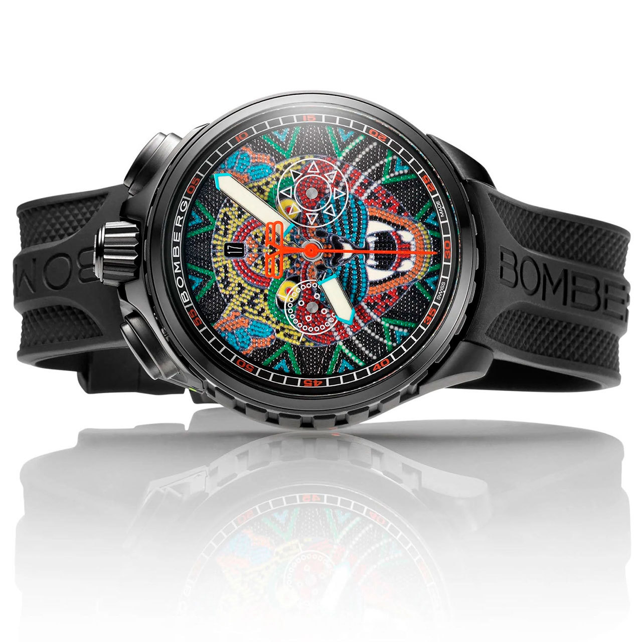 Корпус: Круглый корпус выполнен из нержавеющей стали марки 316L, стойкое к царапинам PVD покрытие черного цвета. Красочный ягуар, созданный в мексиканской технике уичоль на циферблате. Фотолюминесцентное покрытие Super-Luminova® на стрелках добавляет остроты, обеспечивая при этом идеальную читаемость даже в самых темных условиях. Уникальный дизайнс завинчивающейся заводной головкой в положении «12 часов» и кнопок хронографа. Сапфировое стекло с антибликовым покрытием. Диаметр: 45 мм. Водозащита: 50 м.