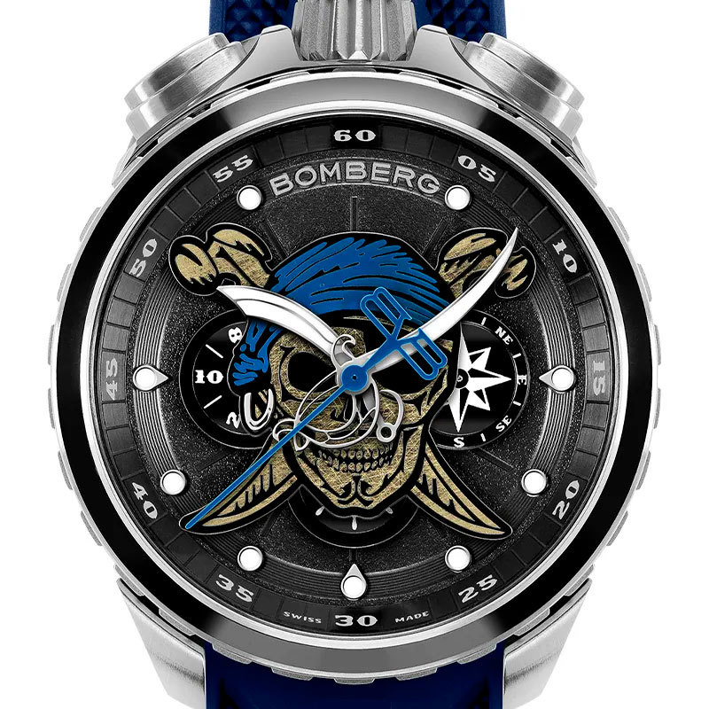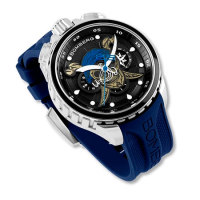 Корпус: Круглый стальной корпус марки 316L. Чёрный циферблат, часовые индексы и стрелки из белой латуни с люминесцентным покрытием (Super-LumiNova). На циферблате изображен уникальный рельефный череп. Сапфировое стекло с антибликовым покрытием. Уникальный дизайн с завинчивающейся заводной головкой в положении «12 часов» и кнопок хронографа. Завинчивающаяся задняя крышка. Диаметр: 45 мм. Водозащита: 50 м.