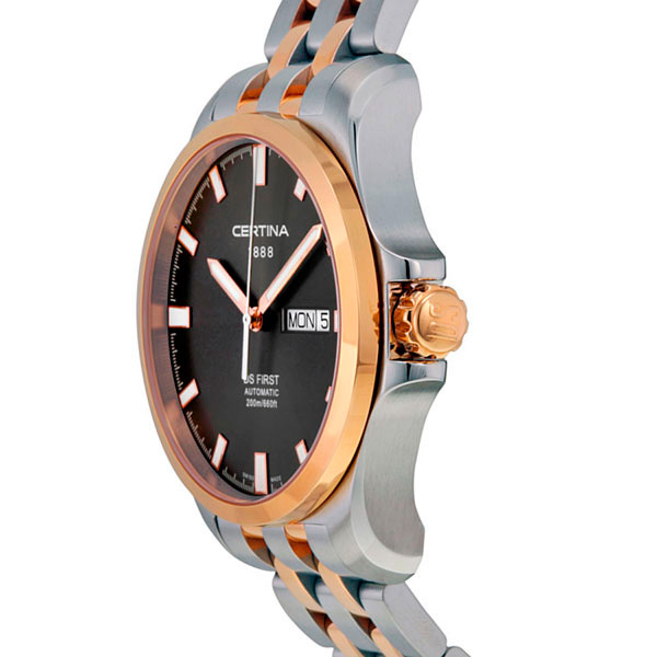 Корпус: Корпус из нержавеющей полированной/матовой стали, безель с PVD - покрытием розового золота. Серый циферблат. Стрелки и часовые индексы золотистого цвета. Сапфировое стекло. Диаметр 40.3 мм. Водостойкость 200 м. Система DS.