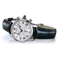 Функции: Индикация часов и  минут при помощи центральных стрелок. Маленькая, отдельно вынесенная секундная стрелка и дата в положении "6 часов". Хронограф.