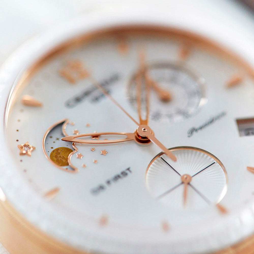 Корпус: Корпус из нержавеющей полированной стали с PVD покрытием розового золота и рельефным керамическим безелем. Белый перламутровый циферблат с золотистыми стрелками и рисками, один бриллиант на месте условного часового индекса (10 часов). Сапфировое стекло с антибликовым покрытием. Диаметр 38 мм. Водостойкость 100 м.