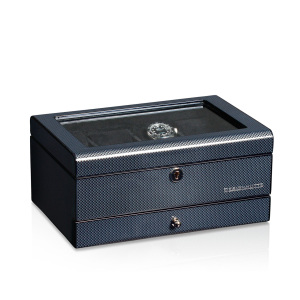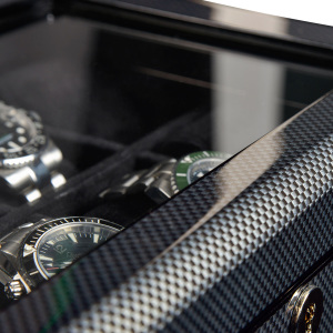 Материал: Шкатулка из натурального дерева, чёрного цвета. Глянцевая поверхность из карбона сразу напоминает элементы гонок и придает коробке для часов спортивную, роскошную элегантность. Внутренняя часть обшита мягкой тканью для защиты часов. Все часы помещены на отдельную подушку для часов, которая расположена в квадрате, огороженном решетками для защиты. Чтобы обеспечить удобное хранение часов даже с большими часами, размер каждого karee составляет примерно 90x47 мм. Мягкие подушечки для часов имеют ширину около 46 мм. Окружность составляет около 175 мм.