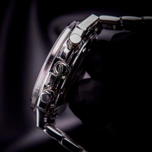 Функции: Центральные часовая и минутная стрелки, секундная стрелка вынесена на малый циферблат. Апертура даты в позиции 4 часов. Секундомер.