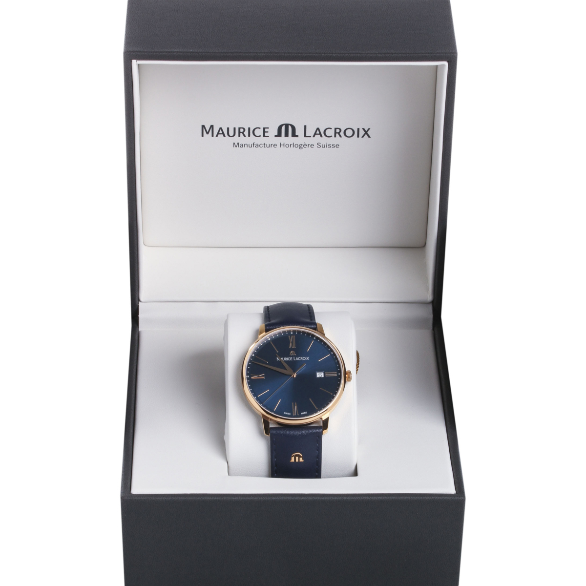 Корпус: Нержавеющая сталь с PVD покрытием золотом розового цвета. Синий циферблат с золотистыми стрелками. Сапфировое стекло. Диаметр 40 мм. Водонепроницаемость 50 метров.