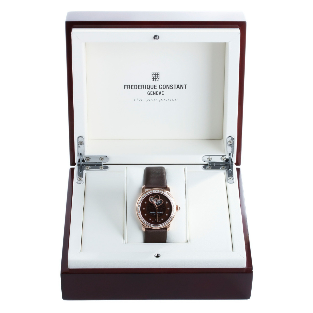 Корпус: Корпус из нержавеющей полированной/матовой стали c покрытием золота, украшен 56 бриллиантами. Циферблат коричневого цвета и искусно гильошированный узором в виде мелких сердец. Часовые метки украшены бриллиантами высокой чистоты. Стрелки часов и римская цифра изготовлены из полированного металла и покрыты розовым золотом. Сапфировое стекло. Диаметр 34 мм. Водостойкость 60 м.