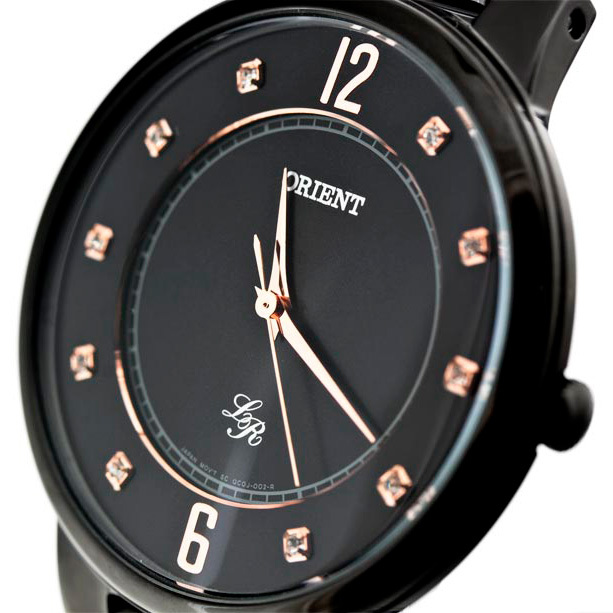 Корпус: Корпус этих часов выполнен из нержавеющей стали с IP покрытием чёрного цвета. Минеральное стекло. Чёрный циферблат украшен кристаллами. Диаметр корпуса 36 мм, толщина 9 мм. Водоустойчивость 30 метров.