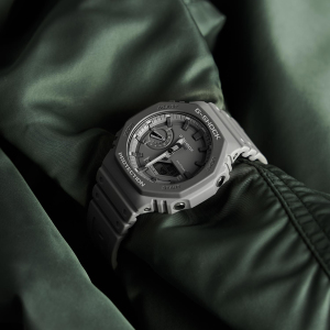 Корпус: Противоударный корпус серого цвета из полимерного материала с карбоновыми волокнами более прочный и, в то же время, более легкий. Этот материал защищает внутренний модуль от повреждений и деформаций при ударах. Высококонтрастный электронный серый ЖК-циферблат защищен акриловым стеклом. Электролюминесцентная подсветка освещает весь циферблат. Функция парный иллюминатор обеспечивает подсветку не только аналогового циферблата, но и цифрового дисплея. Цвет подсветки белый. Необритовое светонакопительное покрытие обеспечивает длительное послесвечение в темноте даже после кратковременного нахождения на свету. Размер 45,4 мм x 48,5 мм х 11,8 мм. Водозащита 200 метров.