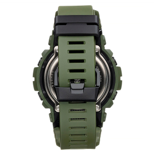 Корпус: Противоударный корпус матового цвета хаки из полимерного материала с высоким безелем, дополнительно защищающим закаленное минеральное стекло. Корпус защищён от повреждений и деформаций при ударах. Высококонтрастный LCD-индикатор циферблата оснащен автоматической электронной подсветкой, которая активируется поворотом кисти. Цвет подсветки белый. Модели этой серии оснащены многосегментными цифровыми дисплеями для улучшения читаемости. Цифровой дисплей разделен на верхнюю и нижнюю секции, в правом верхнем углу находится цифровой диск. Каждая область отображения показывает различные измерения, хронометраж и другую информацию, которая предоставляет полезные данные о вашей повседневной деятельности. Размер 48,6 мм x 54,1 мм х 15,5 мм. Водозащита 200 метров.