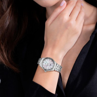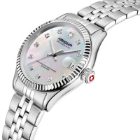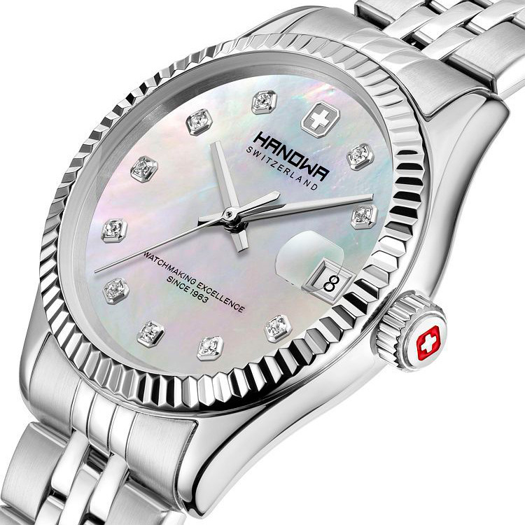 Корпус: Корпус часов изготовлен из стали 316L. Перламутровый циферблат, украшен кристаллами. Стрелки и часовые индексы из стали. Закалённое минеральное стекло с сапфировым покрытием. Диаметр корпуса: 36 мм. Водозащита до 50 метров позволит принимать душ или умываться, не снимая часов.
