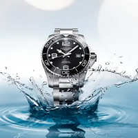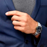 Корпус: Круглый массивный корпус выполнен из нержавеющей стали, поверхности с матовой шлифовкой сатинированием и глянцевой полировкой. Безель с накладкой из черной керамики с контрастной шкалой вращается в направлении против хода стрелок. Сапфировое стекло с антибликовым покрытием. Циферблат черного цвета. Фотолюминесцентный состав Swiss Super-LumiNova на стрелках и цифрах, светящийся в темноте. Диаметр 41 мм. Закручивающаяся задняя крышка с гравировкой и переводная коронка с винтовой фиксацией. Водостойкость 30 бар.