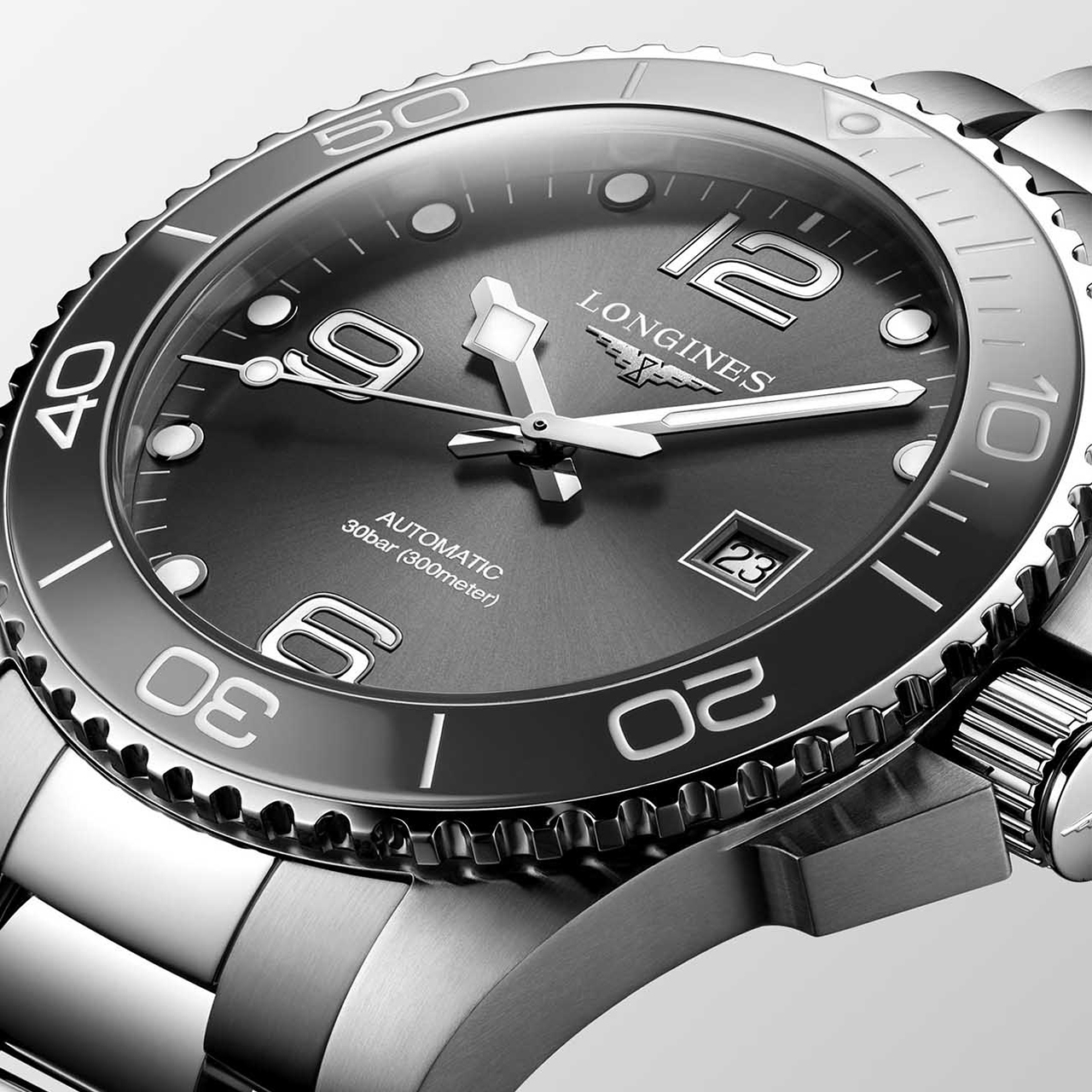 Корпус: Корпус выполнен из высококачественной стали 316L. Однонаправленный безель вращается со щелчками только в направлении против хода стрелок, боковая грань с ребристой насечкой, фронтальная поверхность из керамики с контрастной разметкой, на отметке “12 часов” находится капсула со светящимся в темноте фотолюминесцентным элементом. Серый циферблат с узором sunray. Посеребренные полированные стрелки с покрытием Super-LumiNova®. Устойчивое к царапинам сапфировое стекло с многослойным антибликовым покрытием с обеих сторон. Диаметр: 43 мм. Водонепроницаемость: 300 метров, завинчивающаяся заводная коронка.