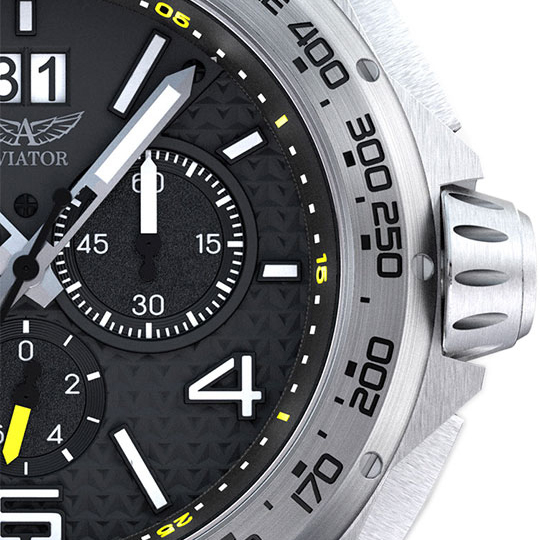 Корпус: Нержавеющая сталь. Диаметр корпуса 45 мм. Сапфировое стекло с антибликовым покрытием. Водонепроницаемость 100 метров. Завинчивающаяся задняя крышка украшена 3D-гравировкой самолета. Заводная головка с защитой. Стрелки и риски с люминесцентным (светонакопительным) составом SuperLuminova.