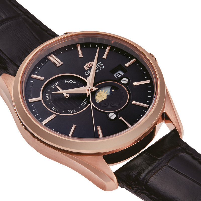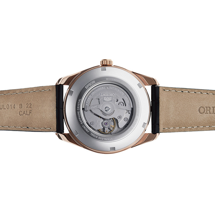 Корпус: Корпус выполнен из нержавеющей стали с PVD покрытием цвета розового золота. Чёрный циферблат с часовыми индексами в виде штрихов. Прозрачная задняя крышка. Диаметр корпуса 42 мм. Водозащита 50м. Устойчивое к возникновению царапин сапфировое стекло.