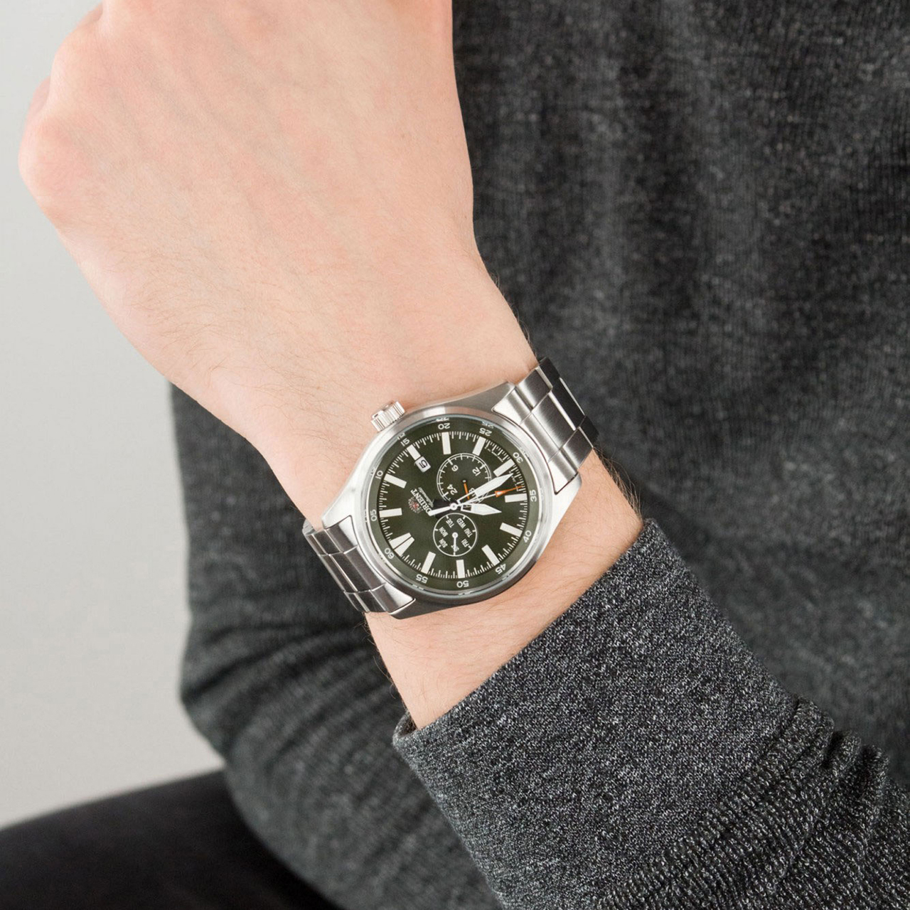 Корпус: Нержавеющая матовая сталь. Тёмный циферблат. Аппликация часовых индексов, а также стрелки - из стали с полировкой до алмазного блеска. Фотолюминесцентный состав на стрелках и на разметке циферблат. Минеральное стекло. Заводная головка с защитой. Завинчивающаяся задняя крышка. Диаметр 42 мм. Водонепроницаемисть 100 м.