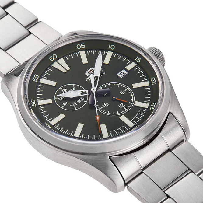 Функции: Центральные часовая, минутная и секундная стрелки. Апертура даты в позиции 3 часов. Индикация дня недели. 12/24х часовой формат времени.