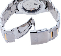 Ремешок: Надежный стальной браслет с частичным PVD покрытием цвета жёлтого золота и раскладывающейся застежкой.