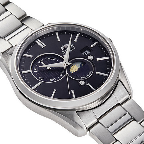 Функции: Индикация часов, минут и секунд при помощи центральных стрелок. Дата. День недели отображается на отдельном циферблате. Индикатор день/ночь.