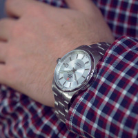 Корпус: Корпус выполнен из нержавеющей стали. Светлый циферблат. Стрелки и часовые индексы из полированного металла. Сапфировое стекло. Водонепроницаемость 100 метров. Диаметр 39 мм.