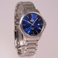 Корпус: Корпус выполнен из нержавеющей стали. Синий циферблат. Стрелки и часовые индексы из полированного металла. Минеральное стекло с сапфировым покрытием. Водонепроницаемость 100 метров. Диаметр 40 мм.