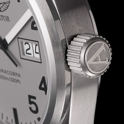 Корпус: Корпус выполнен из высококачественной стали марки 316L с повышенной устойчивостью к коррозии, поверхности с матовой шлифовкой – сатинированием. Матовый циферблат с зернистой отделкой имеет окраску серого цвета. Черные часовые метки и цифры в стиле “пилот” выполнены методом печати. Стрелки и часовые метки благодаря яркому люминесцентному покрытию SuperLuminova отлично читаются в полнейшей темноте и в условиях слабой освещенности. Сапфировое стекло с двусторонним антибликовым покрытием имеет повышенную устойчивость к возникновению царапин. Переводная коронка с двойным уплотнителем и винтовой фиксацией для дополнительной защиты от попадания воды внутрь корпуса. Задняя крышка имеет резьбовое соединение с корпусом. В оформлении задней крышки использована стилизация под элементы дизайна самолетов Airacobra. Диаметр корпуса составляет 42 мм, толщина - 12,2 мм. Водостойкость 100 метров (10 АТМ).