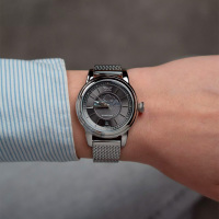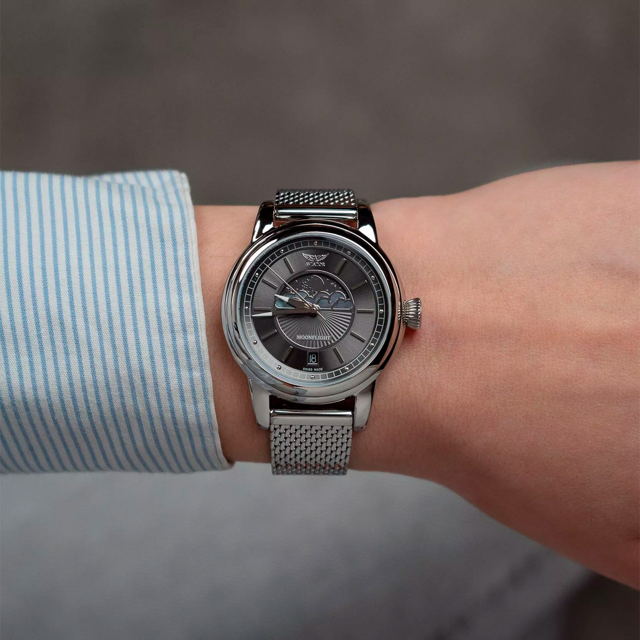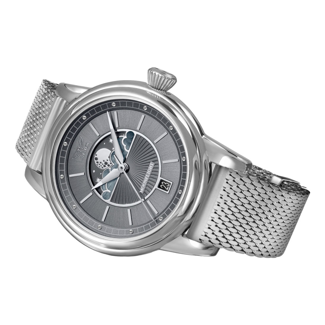 Корпус: Корпус круглой формы выполнен из нержавеющей стали марки 316L. Циферблат серого цвета с различными видами финишной обработки. В центральной части стилизация под гильоширование, окруженная шлифовкой в стиле «солнечные лучи». Аппликация часовых индексов и меток-точек. Облака рядом с индикатором фаз Луны с инкрустацией перламутром. Сапфировое стекло с двусторонним антибликовым покрытием имеет повышенную устойчивость к возникновению царапин. Задняя крышка с гравированным изображением авиалайнера Douglas DC-3 имеет винтовое соединение с корпусом. Диаметр: 36 мм. Водостойкость 100 метров (10 АТМ).