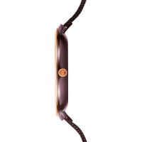 Корпус: Корпус выполнен из стали с IP покрытием. Сапфировое стекло повышенной прочности. Коричневого цвета циферблат с золотистыми стрелками и часовыми индексами. Диаметр: 32 мм. Водонепроницаемость: 30 метров.