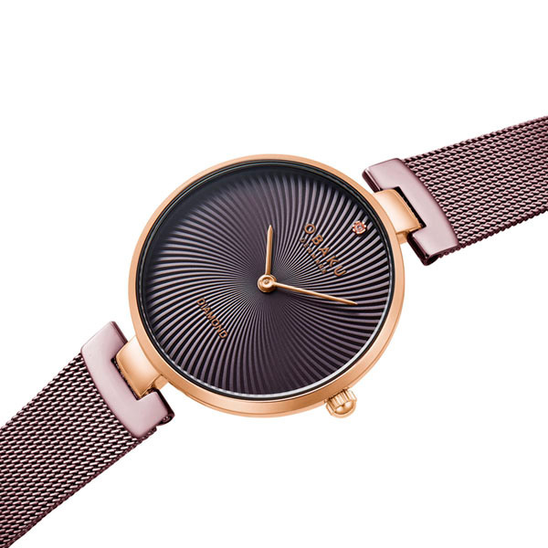 Корпус: Корпус из частично сатинированной стали с IP покрытием цвета розового золота. Тёмный циферблат с золотистыми стрелками декорирован бриллиантом. Минеральное стекло. Диаметр 36 мм. Водозащита 30 метров.