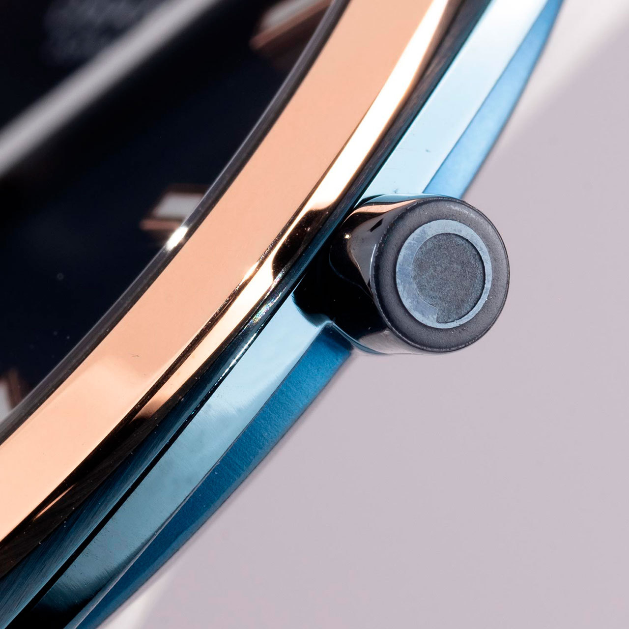 Корпус: Круглый корпус выполнен из нержавеющей стали с IP покрытием цвета розового золота и синего. Синий циферблат с часовыми индексами в виде штрихов. Устойчивое к возникновению мелких механических повреждений минеральное стекло. Размер корпуса составляет 32 мм. Водостойкость WR 30 (брызги).