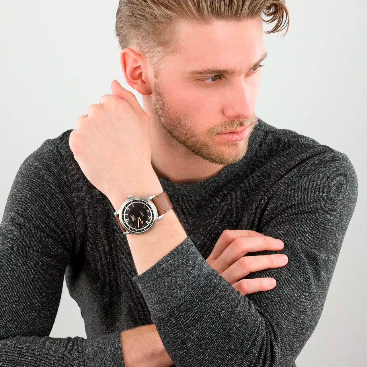 Ремешок: Коричневый ремешок из телячьей кожи в винтажном стиле, ширина 22/18 мм. Объемная застежка пряжка из нержавеющей стали.