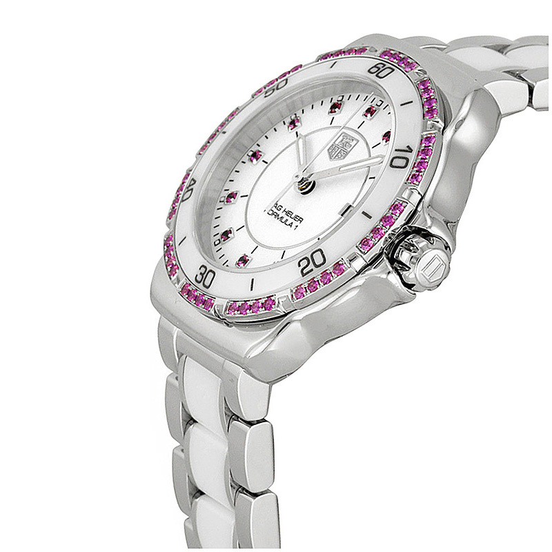 Корпус: Корпус из нержавеющей стали. Полированный неподвижный безель из стали и белой керамики с выгравированной минутной шкалой. Устойчивое к царапинам сапфировое стекло. Белый циферблат. 48 розовых сапфиров на безеле, 12 розовых сапфиров на циферблате. Диаметр 32 мм. Водостойкость 200 м.