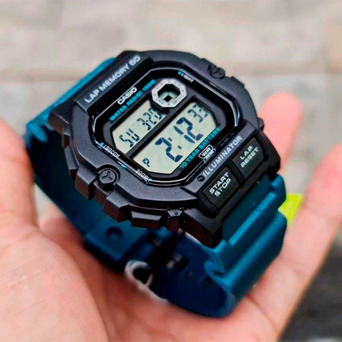 Корпус: Корпус из полимерного материала чёрного цвета. Циферблат серого цвета вокруг дисплея. Дисплей серого цвета, цифры чёрного. Акриловое стекло. Габаритные размеры: 44,5х47,2мм, толщина 13,4мм, вес 43г. Водозащита: 100 м.