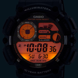 Функции: Цифровой дисплей. Второй часовой пояс. 12-ти и 24-х часовой формат времени.3 будильника, 1 с функцией повтора. Секундомер с точностью показаний 1/100с и временем измерения 24ч. SPLIT-хронограф. Таймер обратного отсчета от 1мин до 24ч с автоповтором. Индикатор рыбалки - определяет время, наиболее подходящего для рыбалки. На экране отображаются символы в виде одного из четырех уровней в зависимости от времени идеально подходящего для рыбалки. Отображение возраста Луны на конкретную дату и графика фаз Луны. Функции включения/отключения звука и включения/отключения летнего времени. Типы сигналов: ежедневный, ежемесячный, каждый день определенного месяца, на определенную дату.