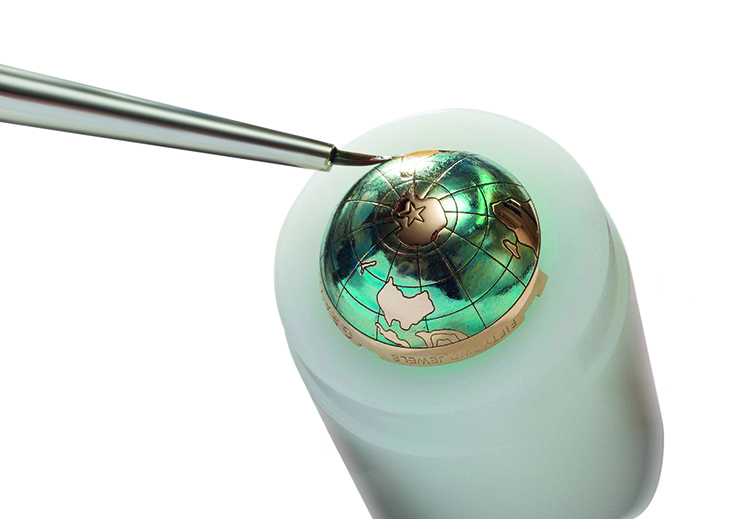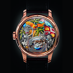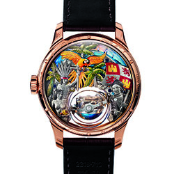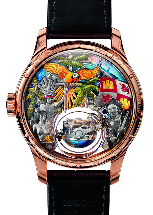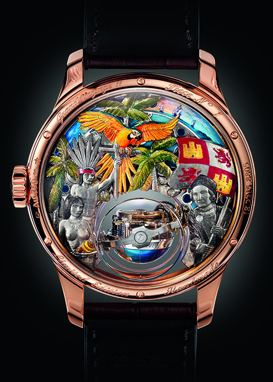 Пожалуй, самой привлекательной частью новинки является тыльная сторона корпуса, украшенная великолепной отделкой, представляющей собой подлинное произведение искусства, потребовавшее больших усилий от часовщиков, инженеров и мастеров-декораторов. Все они справились с трудновыполнимой задачей: основательно переработать оригинальную модель «Academy Christophe Colomb» таким образом, чтобы под выпуклым сапфировым стеклом корпуса диаметром 45 мм из розового золота представить всё разнообразие декоративных элементов и сохранить при этом точность и надёжность механизма. То, что такая задача была великолепно решена, лишнее подтверждение творческой смелости талантливых мастеров и их удивительной способности сочетать чудеса механики с необыкновенным по сложности декором.