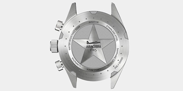 Поверните эти часы, и история, стоящая за этой моделью, раскроет их авиационный дизайн. Задняя часть корпуса притягивает прямые сигналы от самолета Airacobra – от четырех винтов по периметру до тонких технических описаний. А значок самолета Airacobra, выгравированный на задней стороне корпуса, еще больше отдает дань уважения этому героическому истребителю Второй мировой войны.