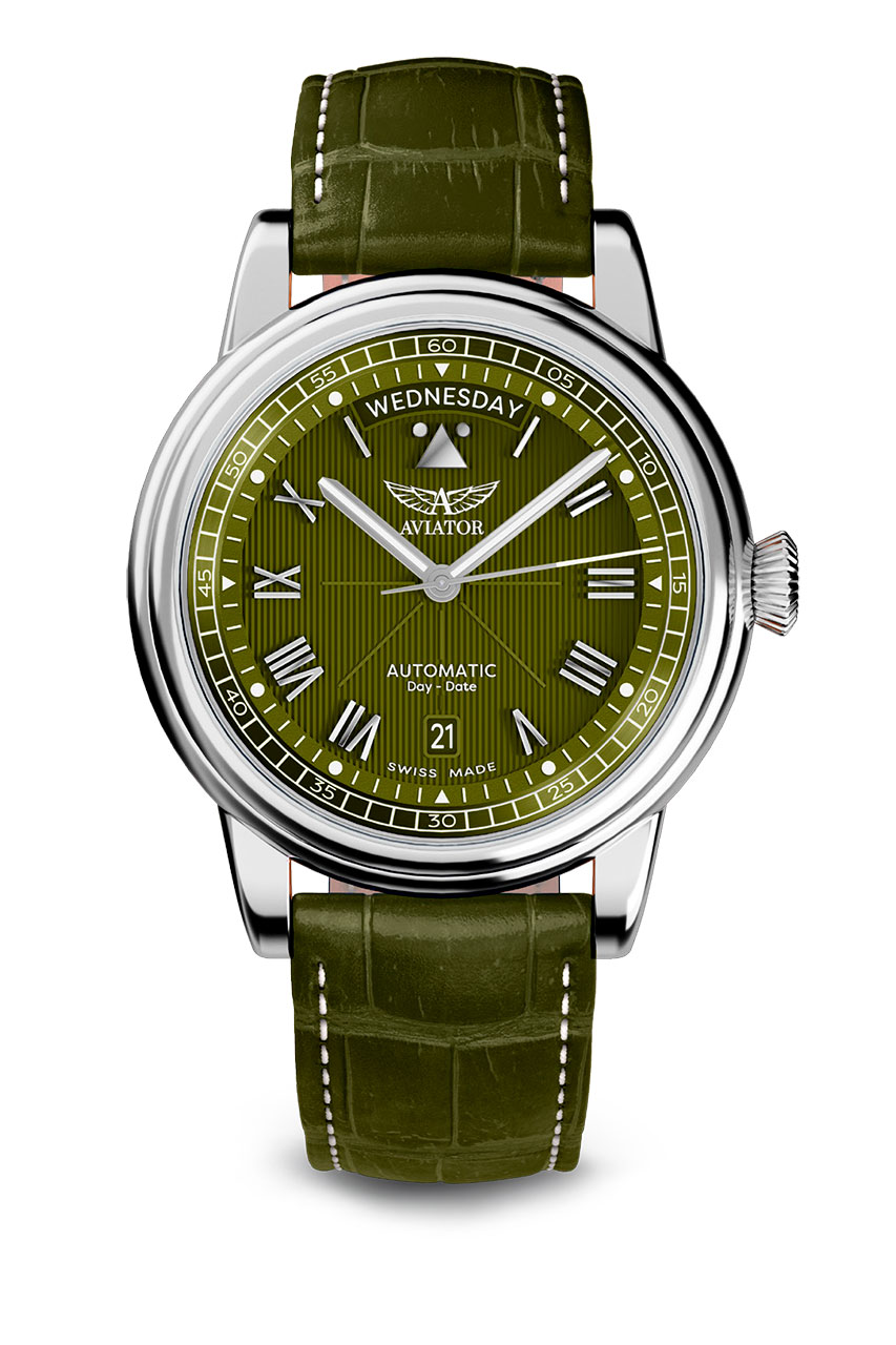 На переливающемся циферблате часов AVIATOR Douglas Day Date применена отделка в технике 3D, которая представляет собой объемный узор в виде глубоких вертикальных линий, а также объемные знаки и надписи. В изящно изогнутом окошке отображаются дни недели, также имеется закругленное окно для индикации даты. Читаемость циферблата является неотъемлемым элементом часов AVIATOR Douglas DayDate 41. Они удачно совмещают стиль ар-деко с элементами функциональности. Отполированные до совершенства крупные металлические римские цифры и многоуровневые кольца с индексами со светомассой SuperLuminova и минутной шкалой позволяют быстро и легко считывать информацию. Все это делает модель вневременным образцом часового искусства.