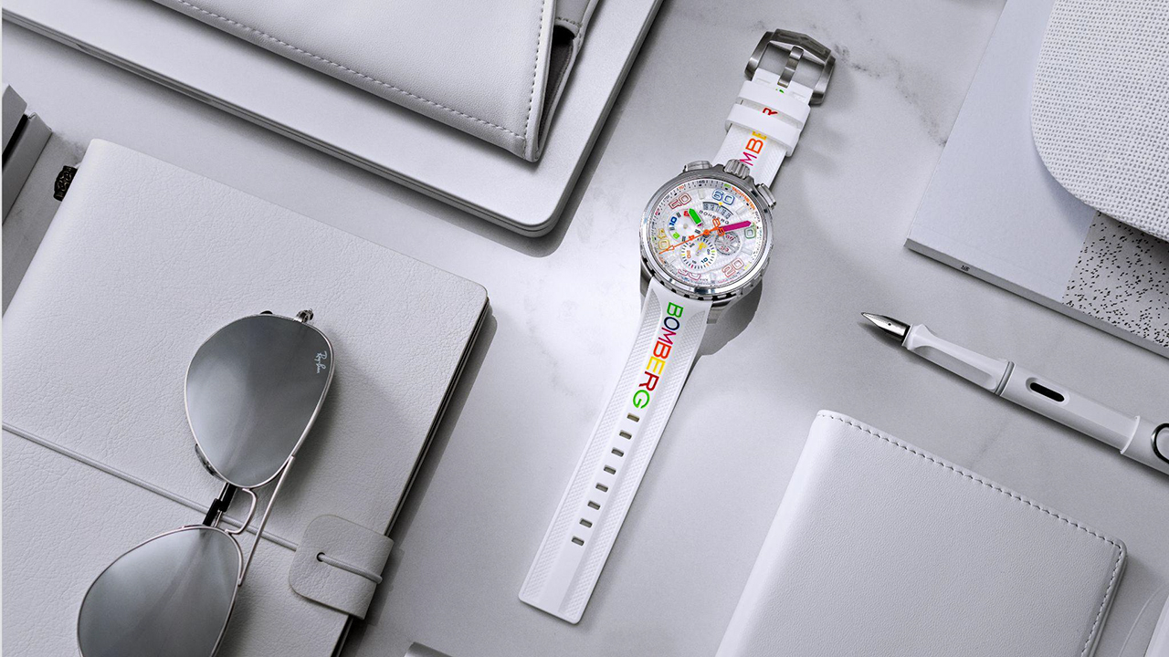 - Ремешок: белый силиконовый с многоцветными буквами BOMBERG