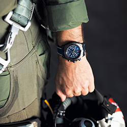 Часы Breitling Avenger Chronograph 45 Swiss Air Force Team Limited Edition обладают 45-миллиметровым корпусом из нержавеющей стали, оснащенным вращающимся в одном направлении безелем с храповым механизмом. На циферблате черного цвета в положении «9 часов» выделяется дополнительный счетчик. На него нанесен логотип пилотажной группы ВВС Швейцарии, при этом красные и желтые акценты созвучны цветовой гамме логотипа. Ярким декоративным элементом также служит секундная стрелка с наконечником желтого цвета. На стрелки и черные индексы нанесено люминесцентное покрытие Super-LumiNova®, что гарантирует удобство считывания времени при любом уровне освещенности. На задней крышке корпуса выгравирован логотип швейцарской пилотажной группы. По случаю юбилея он представляет собой стилизованное изображение числа 55 и шести летящих реактивных самолетов. Надпись «ONE OF 550» указывает на ограниченный тираж серии. В корпус Avenger Chronograph 45 Swiss Air Force Team Limited Edition встроен калибр Breitling Caliber 13, сертифицированный Швейцарским институтом официального тестирования хронометров (COSC) и имеющий запас хода около 48 часов. Водонепроницаемость часов – до 30 бар (300 м). Хронографы Avenger этой специальной лимитированной серии предлагаются в комплекте с кожаным армейским ремешком антрацитового цвета с классической застежкой.