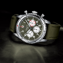 Хронометр, прошедший сертификацию COSC, обладает водонепроницаемостью до 10 бар (100 м) и оснащен армейским ремешком цвета хаки.