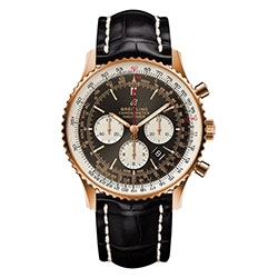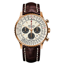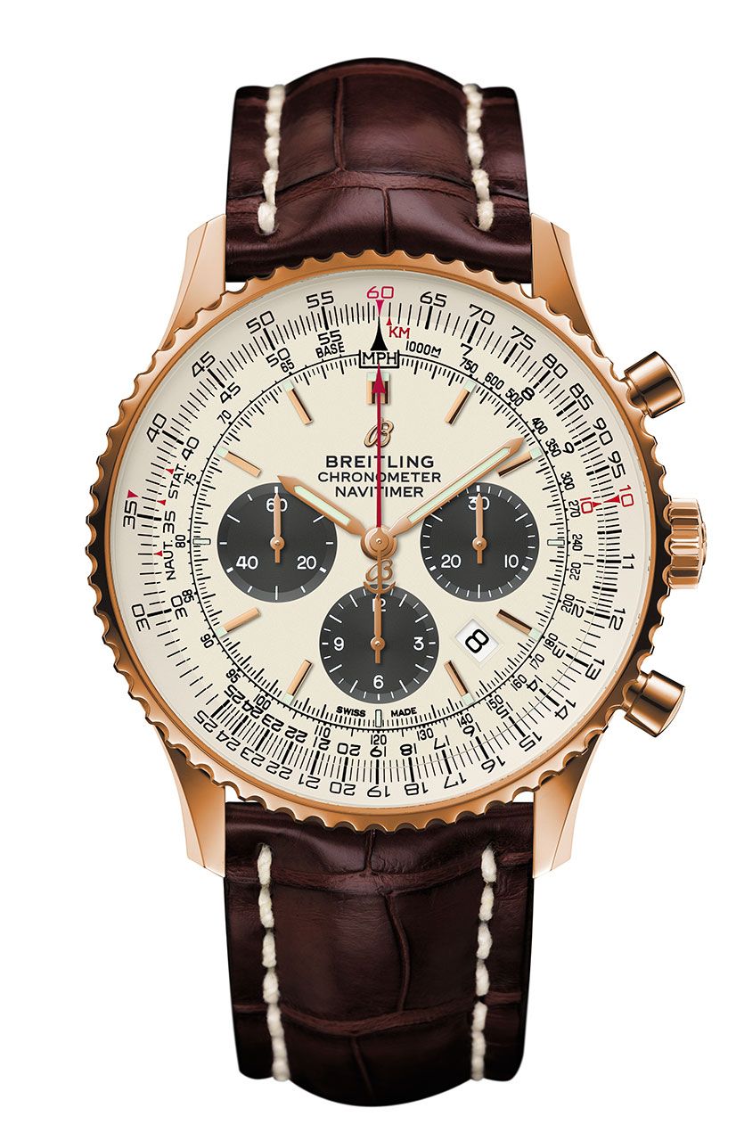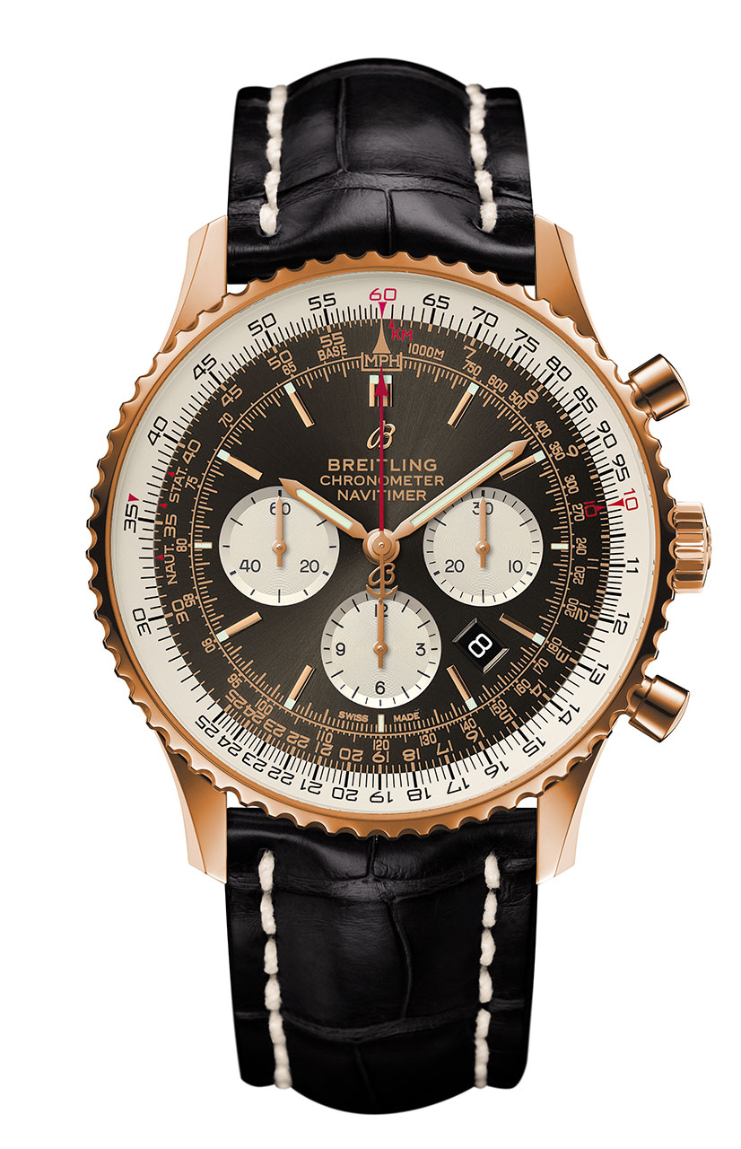 Модель Navitimer 1 B01 Chronograph 46 размером 46 мм в корпусе из 18-каратного красного золота отличается четкостью линий и неповторимым стилем. Часы доступны в двух вариантах: с циферблатом цвета антрацита и черным ремешком из кожи аллигатора, а также в исполнении с серебристым циферблатом и коричневым кожаным ремешком. Хронограф оснащен легендарным, вращающимся в оба направления безелем Breitling с круглой логарифмической линейкой. Часовая и минутная стрелки с покрытием по технологии Super-LumiNova® гарантируют удобство считывания показаний при любых условиях освещения.