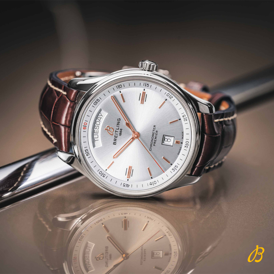 Модель Breitling Premier Automatic Day & Date 40 отображает не только время, но – как на то указывает ее название – также день недели и дату, окошки которых расположены в положениях «12» и «6 часов» соответственно. Эта модель автоматических часов приводится в движение с помощью хронографического механизма с автоподзаводом калибра Breitling Caliber 45. Premier Automatic Day & Date 40 предлагаются с черным или серебристым циферблатом и поставляются с браслетом из нержавеющей стали, ремешком из нубука либо кожи аллигатора с белой прострочкой.