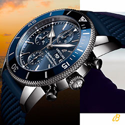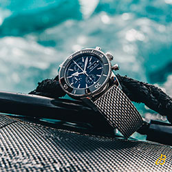 Superocean Héritage II Chronograph 44 доступен в двух версиях из нержавеющей стали: одна ‒ с черным циферблатом и стальным браслетом Ocean Classic, вторая – с синим циферблатом и идеально дополняющим его синим каучуковым ремешком Aero Classic.