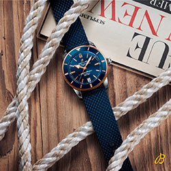 Хронометр Superocean Héritage II B20 Automatic 44 по праву считается элегантной и яркой интерпретацией этой коллекции. Часовая модель с тремя стрелками оснащена механизмом Manufacture Caliber B20. Вниманию ценителей предлагаются две изысканные версии из нержавеющей стали: одна ‒ с черным циферблатом на черном каучуковом ремешке Aero Ocean Classic, вторая – с синим циферблатом и стальным браслетом Ocean Classic.