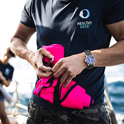 Главной особенностью Superocean Outerknown является уникальный ремешок цвета хаки. Он изготовлен из инновационного материала ECONYL®, который производят из переработанных нейлоновых отходов, в том числе остатков использованных рыболовных сетей, найденных в морях и океанах.